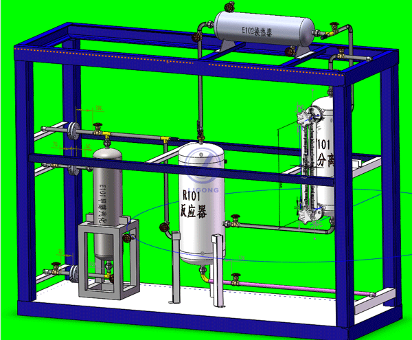 整套裝置由鋼制安裝框架、反應器、換熱器、冷凝器、汽化器、仿真儀表、就地計算機操作臺、、就地智能儀表控制上位監(jiān)控軟件、外置配套設備等組成。,工藝路線簡潔清晰,現(xiàn)場儀表與通訊模塊有機結合,上位計算機控制,設置DCS界面及自動評分系統(tǒng)。
