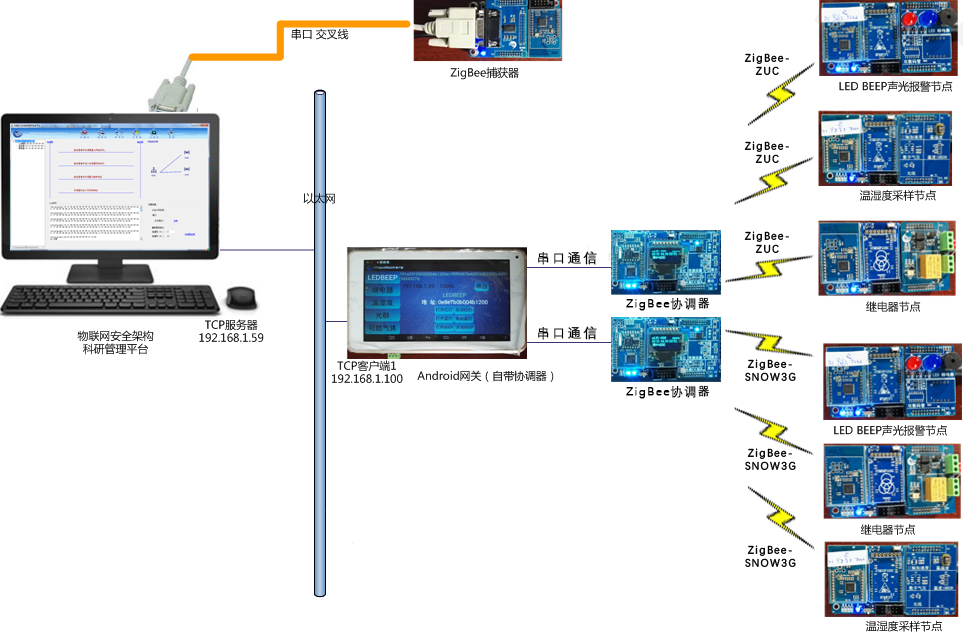 包含2組ZigBee自組網(wǎng)絡(luò)。ZigBee傳感器節(jié)點(diǎn)與協(xié)調(diào)器之間可配置為加密數(shù)據(jù)傳輸,加密類型支持ZUC、snow3G、Lblock、kasumi、AES五種輕量級(jí)加密算法。ZigBee協(xié)調(diào)器支持白名單入網(wǎng)保障機(jī)制,根據(jù)申請(qǐng)入網(wǎng)設(shè)備的MAC地址識(shí)別并判斷該節(jié)點(diǎn)是否合法,從而做出允許或拒絕入網(wǎng)的動(dòng)作。Android網(wǎng)關(guān)采用TCP協(xié)議與PC服務(wù)器通信,實(shí)時(shí)接收Z(yǔ)igBee協(xié)調(diào)器解密后的傳感層數(shù)據(jù),內(nèi)嵌五種加密類型,支持靈活配置,將傳感層數(shù)據(jù)經(jīng)過(guò)解析、重組,加密傳輸至PC端服務(wù)器信息平臺(tái)。服務(wù)器軟件平臺(tái)通過(guò)捕獲器捕獲傳感網(wǎng)幀,以流程條方式動(dòng)態(tài)展示傳感層認(rèn)證步驟,顯示繪制網(wǎng)絡(luò)拓?fù)浣Y(jié)構(gòu),MAC/NWK/APS數(shù)據(jù)幀詳細(xì)數(shù)據(jù),支持五種輕量級(jí)算法的加解密,分析數(shù)據(jù)幀的加密類型,統(tǒng)計(jì)加密算法的效率、列表顯示設(shè)備狀態(tài)、遠(yuǎn)程監(jiān)測(cè)與控制傳感器設(shè)備等。技術(shù)架構(gòu)如圖所示: