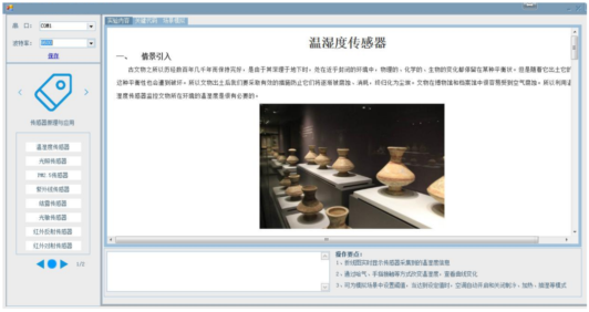 物聯(lián)網(wǎng)基礎技術原理教學平臺的軟件模塊,采用C#上位機教學資源軟件及聯(lián)動場景案例,針對傳感器技術的教學,每一個傳感器的原理、實驗目的、實驗原理、實驗內容、實驗步驟、等實驗指導書內容移植到軟件模塊上,同時對實驗過程、實驗現(xiàn)象相對應顯示出來,實現(xiàn)了理實一體化教學的效果。并且可以在此軟件模塊上加載各系列硬件模塊套件的教學資源,包括實驗場景引入,實驗目的,知識點掌握,實驗步驟,關鍵代碼解析,實驗現(xiàn)象及實驗場景聯(lián)動。能夠讓學生不僅學習傳感器概念、原理,并且可以在邊學原理邊練習操作和開發(fā),生動且有趣。軟件模塊的界面截圖如下圖所示: