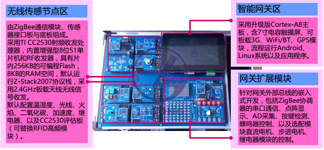 平臺(tái)主要包括 ZigBee 無線傳感器節(jié)點(diǎn)、升級(jí)版 Cortex-A8 智能網(wǎng)關(guān)、以及網(wǎng)關(guān)擴(kuò)展模塊等硬件資源。如圖所示: