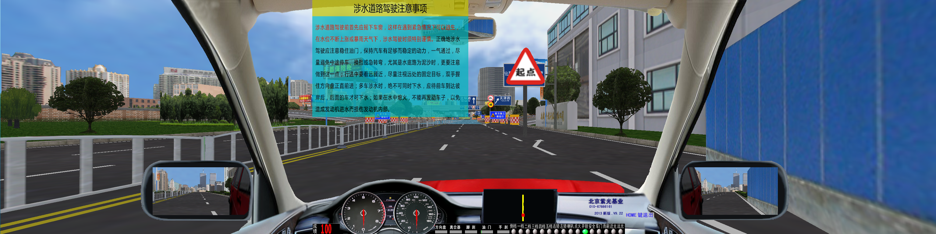 危險(xiǎn)場(chǎng)景:視線不清的交通情況下,超車后突然切入他人道引起被超車輛緊急制動(dòng)、自行車、行人突然橫穿馬路,路面維修,障礙物繞行等 危險(xiǎn)場(chǎng)景、專項(xiàng)駕駛:危險(xiǎn)道路、眩目道路、爆胎體驗(yàn)、緊急避讓、趣味駕駛等駕駛科目。炫目道路:(朝九晚五的太陽(yáng))炫目會(huì)車,炫目駕駛鄉(xiāng)村道路等。泥濘道路:泥濘洼地道路駕駛(方向、制動(dòng)、驅(qū)動(dòng)有打滑滯后感)場(chǎng)景模型取鄉(xiāng)村道路,道路變?yōu)槟酀魻顟B(tài)。石子路面:汽車在其上面行駛,遇到剎車時(shí)剎不住車,還可汽車還在繼續(xù)滑動(dòng),有時(shí)還會(huì)斜向滑行,極難控制感,汽車在石子路面里滑動(dòng)。涉水道路:涉水駕駛汽車有水流沖力對(duì)車輛的前進(jìn)阻力感光及側(cè)滑感,輪胎與水下的路壓力減小,驅(qū)動(dòng)力受到限制,使行駛受阻感覺(jué)。專項(xiàng)訓(xùn)練:要附合交通部要求。系統(tǒng)評(píng)分:每次駕駛結(jié)束,系統(tǒng)自動(dòng)評(píng)分。山區(qū)到路:突出坡多、彎多、凹凸路面、駕駛環(huán)境復(fù)雜、有側(cè)風(fēng)、有陡坡長(zhǎng)坡、溜坡、側(cè)滑(有語(yǔ)音提示)。鄉(xiāng)村道路:含鐵道路口;加油站,公交車站、單行道、農(nóng)田道口等;城市道路:含公交站臺(tái),高架立交橋、公交專用道、十字路口、丁字路口、環(huán)島、隧道、單行道、雙黃線、加油站、商場(chǎng)百貨門口斑馬線天橋,學(xué)校門口及紅綠燈,行人、非機(jī)動(dòng)車亂穿馬路及非機(jī)動(dòng)車等。高速公路:包括收費(fèi)站(入、停、出、)服務(wù)區(qū)、緊急帶、匝道行駛、超車道、行車道、隧道、立交橋、交通標(biāo)牌標(biāo)線。