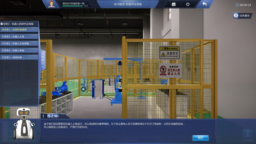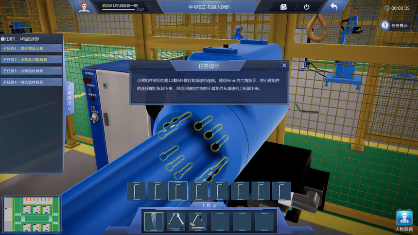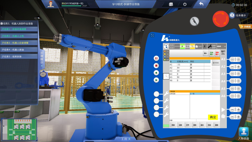 4、學(xué)習(xí)模式教學(xué)實(shí)訓(xùn)任務(wù)豐富:機(jī)器人拆裝作業(yè)準(zhǔn)備虛擬仿真實(shí)訓(xùn)項(xiàng)目包含拆裝作業(yè)防護(hù)準(zhǔn)備、機(jī)器人拆裝工具認(rèn)知、機(jī)器人拆卸作業(yè)準(zhǔn)備等至少3個(gè)教學(xué)實(shí)訓(xùn)任務(wù);機(jī)器人本體拆卸虛擬仿真實(shí)訓(xùn)項(xiàng)目包含機(jī)器人整體拆卸、機(jī)器人J6軸到J1軸的分步拆卸、諧波減速機(jī)的認(rèn)知、RV減速機(jī)的認(rèn)知等至少9個(gè)教學(xué)實(shí)訓(xùn)任務(wù);機(jī)器人本體安裝虛擬仿真實(shí)訓(xùn)項(xiàng)目包含機(jī)器人整體安裝、機(jī)器人J1軸到J6軸的分步安裝、機(jī)器人注油、軸承的認(rèn)知、軸的初步認(rèn)知等至少少10個(gè)教學(xué)實(shí)訓(xùn)任務(wù)。機(jī)器人初步調(diào)試項(xiàng)目包含調(diào)試前準(zhǔn)備、機(jī)器人開機(jī)、機(jī)器人關(guān)機(jī)、機(jī)器人基礎(chǔ)調(diào)試、機(jī)器人精度檢測(cè)等至少5個(gè)教學(xué)實(shí)訓(xùn)任務(wù)。