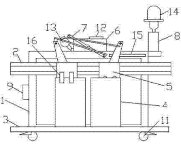如圖1和圖2所示,一種電梯門機(jī)實(shí)訓(xùn)裝置,包括架體1,架體1上下分別固定門導(dǎo)軌2和地坎3,兩個(gè)轎門4頂部分別通過(guò)門刀16和門掛板組件5連接在門導(dǎo)軌2上,轎門4底部卡接在地坎3上,轎門4的門掛板組件5頂部通過(guò)連桿機(jī)構(gòu)7與設(shè)置在架體1頂部的門機(jī)減速裝置6和電機(jī)13相連,門機(jī)減速裝置6設(shè)置門機(jī)控制器12,架體1的底架上設(shè)置配重塊10,架體1頂部設(shè)置照明燈14和手動(dòng)控制機(jī)構(gòu)8,架體1上設(shè)置一個(gè)電源9,架體1底部設(shè)置萬(wàn)向輪11,轎門4頂部的架體上安裝有到位開(kāi)關(guān)15。