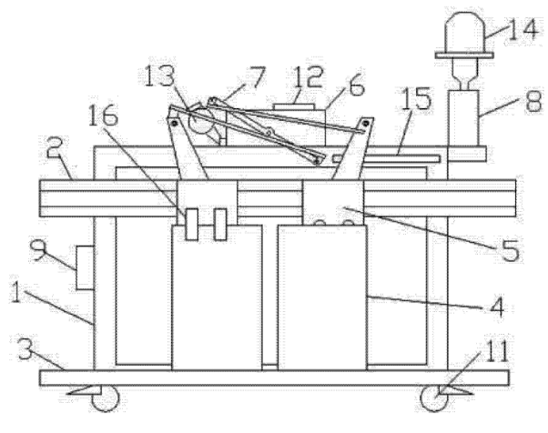 圖中1架體、2門導(dǎo)軌、3地坎、4轎門、5門掛板組件、6門機(jī)減速裝置、7連桿機(jī)構(gòu)、8手動(dòng)控制機(jī)構(gòu)、9電源、10配重塊、11萬(wàn)向輪、12門機(jī)控制器、13電機(jī)、14照明燈、15到位