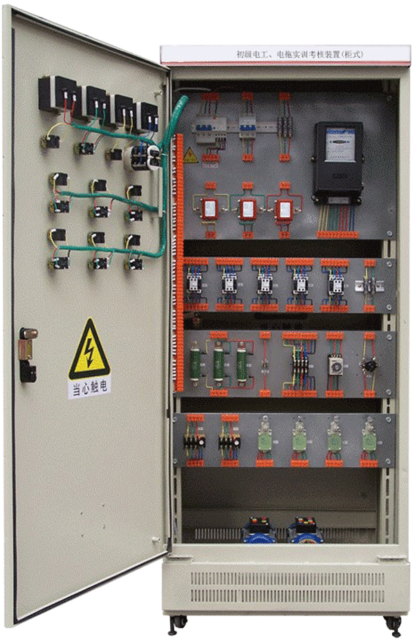電工電拖實訓考核裝置是按照勞動社會保障部頒發(fā)的“工人技術等級標準”和“職業(yè)技能鑒定規(guī)范”的內容要求,根據(jù)初級電工培訓考核的實際情況而設計的新一代集培訓學習、理論驗證、實際操作能力、考核鑒定于一體的多功能柜式設備。整臺設備以標準的電氣控制柜為主柜,利用柜體的雙面空間,布置電器及配套實驗器材,能完成初級電工考核鑒定中的電力拖動控制與照明電路的實操項目,該電工、電拖實訓考核裝置堅持理論聯(lián)系實際的原則,突出技能訓練,注重針對性、實用性、科學性,經(jīng)全國多家職業(yè)技能訓練中心、職校、技校使用證明,該柜體設計合理、實操方便,占地面積少。為延長電器的使用壽命,各電器的接點都與接線端子相連,再讓學生在接線端子上接線,連接電機、電器來完成各項控制實驗,有效降低材料消耗,延長使用壽命。該套設備適用于各勞動職業(yè)技能鑒定部門,同時適應各大、中專、技校、職校電工、電拖專業(yè)教學與實訓考核。