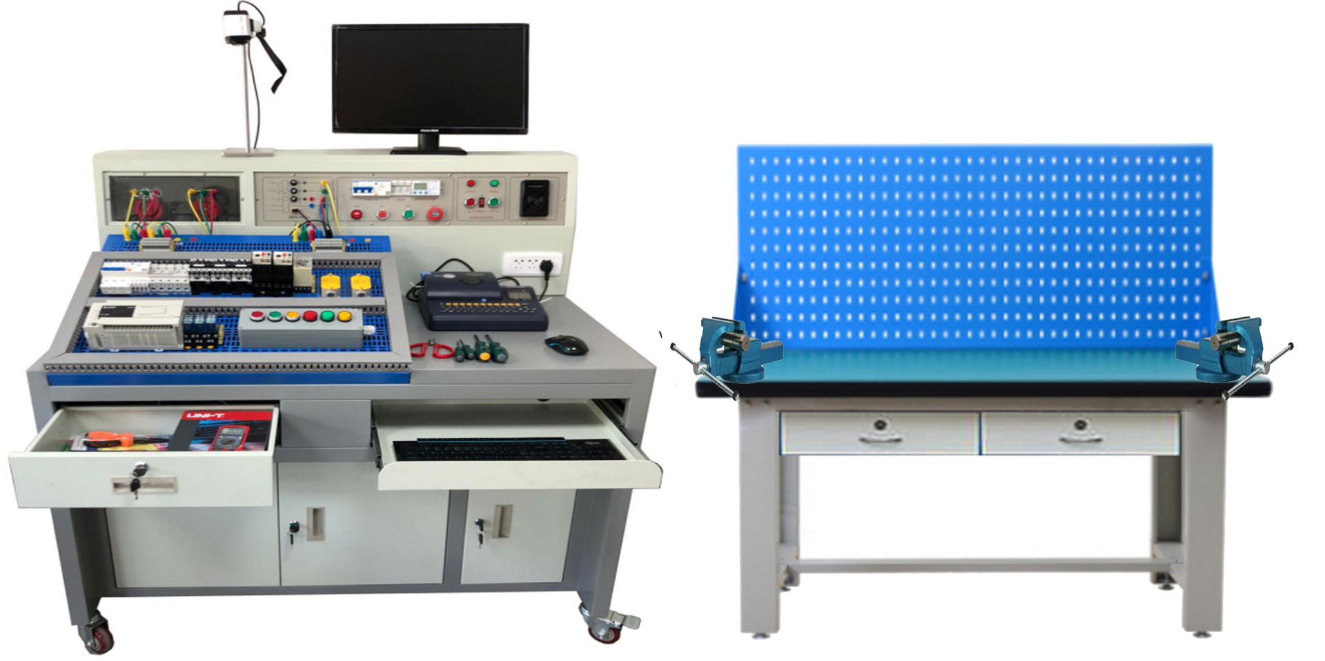 (1)本設(shè)備由實(shí)訓(xùn)屏(內(nèi)置電源)、實(shí)訓(xùn)桌、儲(chǔ)物柜三大部分組成。以30mm×30mm成型方鋼作為設(shè)備主要框架材料;實(shí)訓(xùn)屏、地盤采用焊接連接、關(guān)鍵部位采用三角筋用內(nèi)六角螺釘加固連接,表面經(jīng)高溫噴塑處理,美觀大方且有效起到防銹絕緣的作用;由兩條35mm×35mm鋁合金型材及滑槽組成網(wǎng)孔板固定機(jī)構(gòu);固定機(jī)構(gòu)的下方是鐵制雙工位電源箱,每工位電源箱的布局依次為電源保護(hù)裝置、電源指示裝置、電源輸出;實(shí)訓(xùn)桌桌面采用雙層亞光密紋結(jié)構(gòu),表面經(jīng)過噴塑處理,提高防銹、絕緣性能;實(shí)驗(yàn)桌底部裝有至少4個(gè)導(dǎo)向輪,方便設(shè)備移動(dòng)。