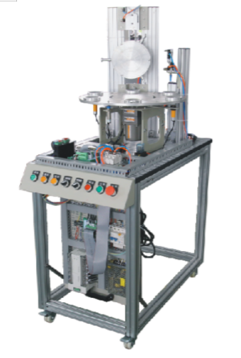 由旋轉(zhuǎn)工作臺(tái)、平面推力軸承、直流減速電機(jī)(10W/24V  5r/m)、刀具庫(kù)(3種刀具)、升降式加工系統(tǒng)、加工組件、檢測(cè)組件、光電傳感器、轉(zhuǎn)臺(tái)到位傳感器、步進(jìn)電機(jī)、步進(jìn)電機(jī)驅(qū)動(dòng)器、電氣掛板等組成。主要完成物料加工和深度的檢測(cè)。工件在旋轉(zhuǎn)平臺(tái)上被檢測(cè)及加工。旋轉(zhuǎn)平臺(tái)由直流電機(jī)驅(qū)動(dòng)。平臺(tái)的定位由繼電器回路完成,通過(guò)電感式傳感器檢測(cè)平臺(tái)的位置。工件在平臺(tái)并行完成檢測(cè)及鉆孔的加工。在進(jìn)行鉆孔加工時(shí),夾緊執(zhí)行件夾緊工件。加工完的工件,通過(guò)電氣分支送到下一個(gè)工作站。