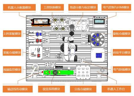 工作臺(tái)整體由兩個(gè)基礎(chǔ)臺(tái)拼接而成,更具空間靈活,拆卸方便等特點(diǎn)。臺(tái)面采用標(biāo)準(zhǔn)鋁型材,機(jī)器人 及功能模塊可根據(jù)需求改變布局位置,所有功能模塊采用手?jǐn)Q螺栓方式固定,可實(shí)現(xiàn)無工具快速拆裝與更 換。每個(gè)模塊電氣部分配置了獨(dú)立的電氣接線盒和快速航插,可實(shí)現(xiàn)模塊整體機(jī)械和電氣快速安裝部署, 還可根據(jù)需求更換或添加功能模塊進(jìn)行功能擴(kuò)展。