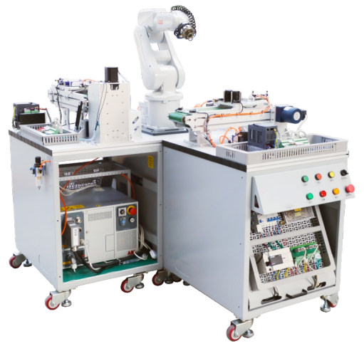 該套設備包含了機器人末端快速換裝法蘭、工業(yè)機器人、步進驅(qū)動器、步進電機、可編程邏輯控制器、光纖傳感器、變頻器、三相異步電動機等多功能一體化實訓裝備,裝備分為三個組合式工作臺,每個工作臺配備一臺PLC可編程邏輯控制器完成一道既定工序,工作臺與工作臺之間PLC通過485串口通訊方式進行連接。