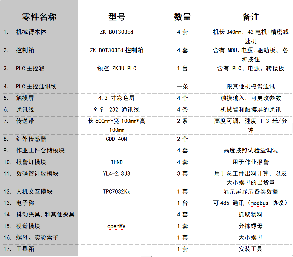 模塊采用ZK-BOT303Ed教學(xué)款機(jī)械臂、底座、末端手爪工具、機(jī)器人控制系統(tǒng)和示教器組成。