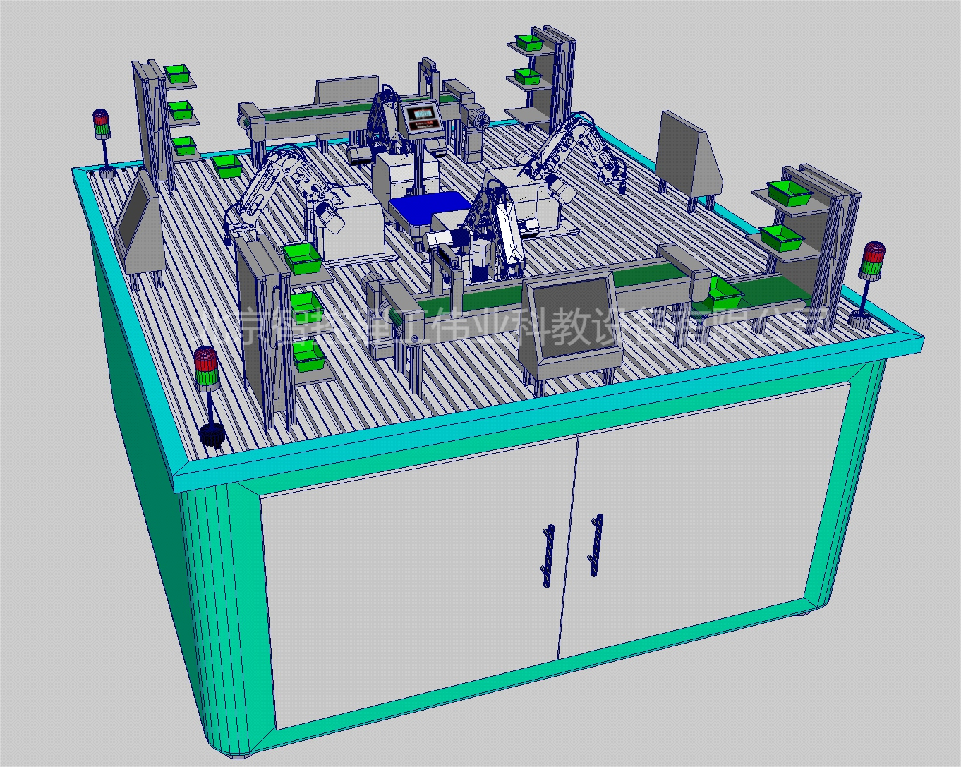 系統(tǒng)各模塊放置于鋁型材實(shí)訓(xùn)臺上,實(shí)訓(xùn)臺主架由鈑金與鋁型材搭建,兩側(cè)安裝擋板,采用半封閉式結(jié)構(gòu)加強(qiáng)空氣流通以便散熱,邊角圓弧處理。前部亞克力材質(zhì)對開門,安全操作方便,外形規(guī)整大方。實(shí)訓(xùn)臺底部配置剎車滾輪和可調(diào)支腳,方便支撐與移動。系統(tǒng)抽展式控制部分水平配滑道放置在實(shí)訓(xùn)臺中央,對門打開時,控制部分可拉出。底部形態(tài):可調(diào)支腳與滾輪。