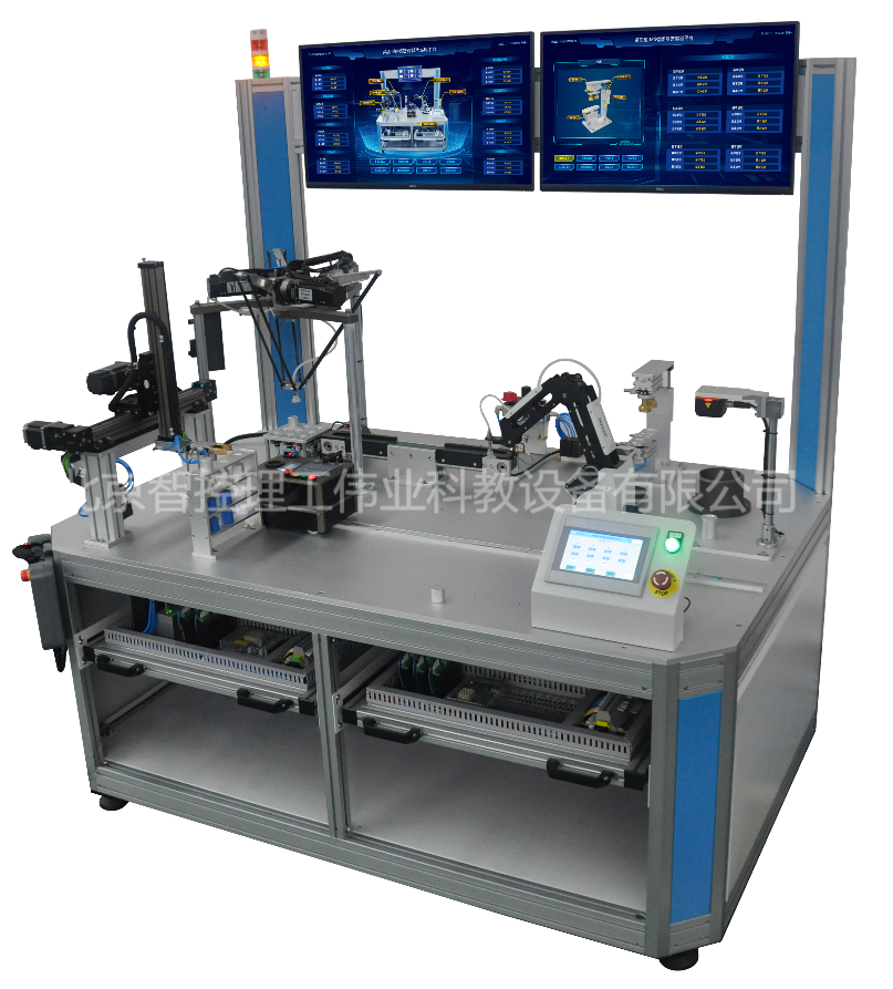 裝置是一套可以模擬一個(gè)智能化車間生產(chǎn)運(yùn)行的綜合性應(yīng)用系統(tǒng),整個(gè)裝置可以實(shí)現(xiàn)從立體倉(cāng)庫(kù)管理、智能小車輸送、機(jī)器人搬運(yùn)、模擬加工、視覺檢測(cè)、數(shù)字化信息采集、可視化數(shù)據(jù)監(jiān)控、工業(yè)互聯(lián)網(wǎng)應(yīng)用開發(fā),實(shí)驗(yàn)裝置流程可實(shí)現(xiàn)由并聯(lián)機(jī)器人取料-傳輸-多軸機(jī)械手搬運(yùn)-加工-檢測(cè)-智能車運(yùn)輸-立體倉(cāng)庫(kù)存的正向流程,配套的數(shù)字孿生系統(tǒng)可以實(shí)現(xiàn)與實(shí)物機(jī)構(gòu)的實(shí)時(shí)同步運(yùn)動(dòng),系統(tǒng)由分布式組合控制方式可以開展單機(jī)應(yīng)用實(shí)訓(xùn),也可以開展組合控制實(shí)訓(xùn)。