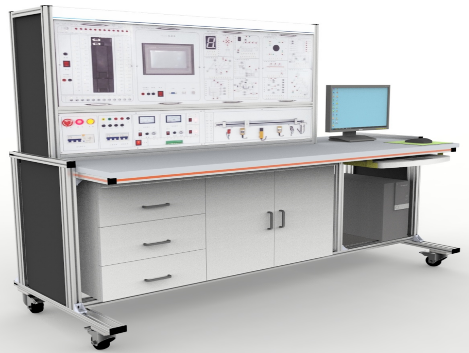 2、臺架構成:實訓臺采用工業(yè)鋁型材加工。桌面下面放置儲物柜,左側有3層抽屜,用于存放工具以及實訓資料,右側為雙拉門式設計,可以放置實訓掛箱。底部裝有四個帶鎖止功能的萬向輪。柜體后下側留有電源輸入線。預留計算機放置位置。