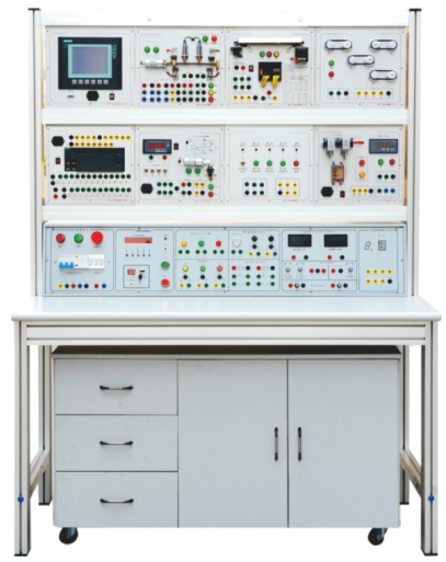 該裝置采用鋁木結(jié)構(gòu)實訓(xùn)臺,實訓(xùn)臺架由實訓(xùn)屏(含電源控制屏)、實訓(xùn)桌、實訓(xùn)儲物柜三大部分組成。實訓(xùn)屏包括電源指示和控制單元、時間管理器(含電源保護)單元、指示燈和按鈕單元、選擇開關(guān)和蜂鳴器及繼電器單元、儀表單元、直流電源單元,電源控制屏的左右兩側(cè)分別裝有一個兩插插座,將外部電源進線端裝在電源控制屏的左側(cè)(采用航空插連接結(jié)構(gòu));實訓(xùn)屏上部采用三根不銹鋼型材組成通用實訓(xùn)模塊固定結(jié)構(gòu),一次可擺放8個實訓(xùn)模塊,模塊采用標準化結(jié)構(gòu)、互換性強,根據(jù)實訓(xùn)內(nèi)容的需要調(diào)換實訓(xùn)模塊;存儲柜用于存放工具材料及模塊。