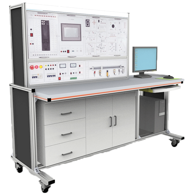 2、臺架構(gòu)成:實訓臺采用工業(yè)鋁型材加工。桌面下面放置儲物柜,左側(cè)有3層抽屜,用于存放工具以及實訓資料,右側(cè)為雙拉門式設(shè)計,可以放置實訓掛箱。底部裝有四個帶鎖止功能的萬向輪。柜體后下側(cè)留有電源輸入線。預(yù)留計算機放置位置。