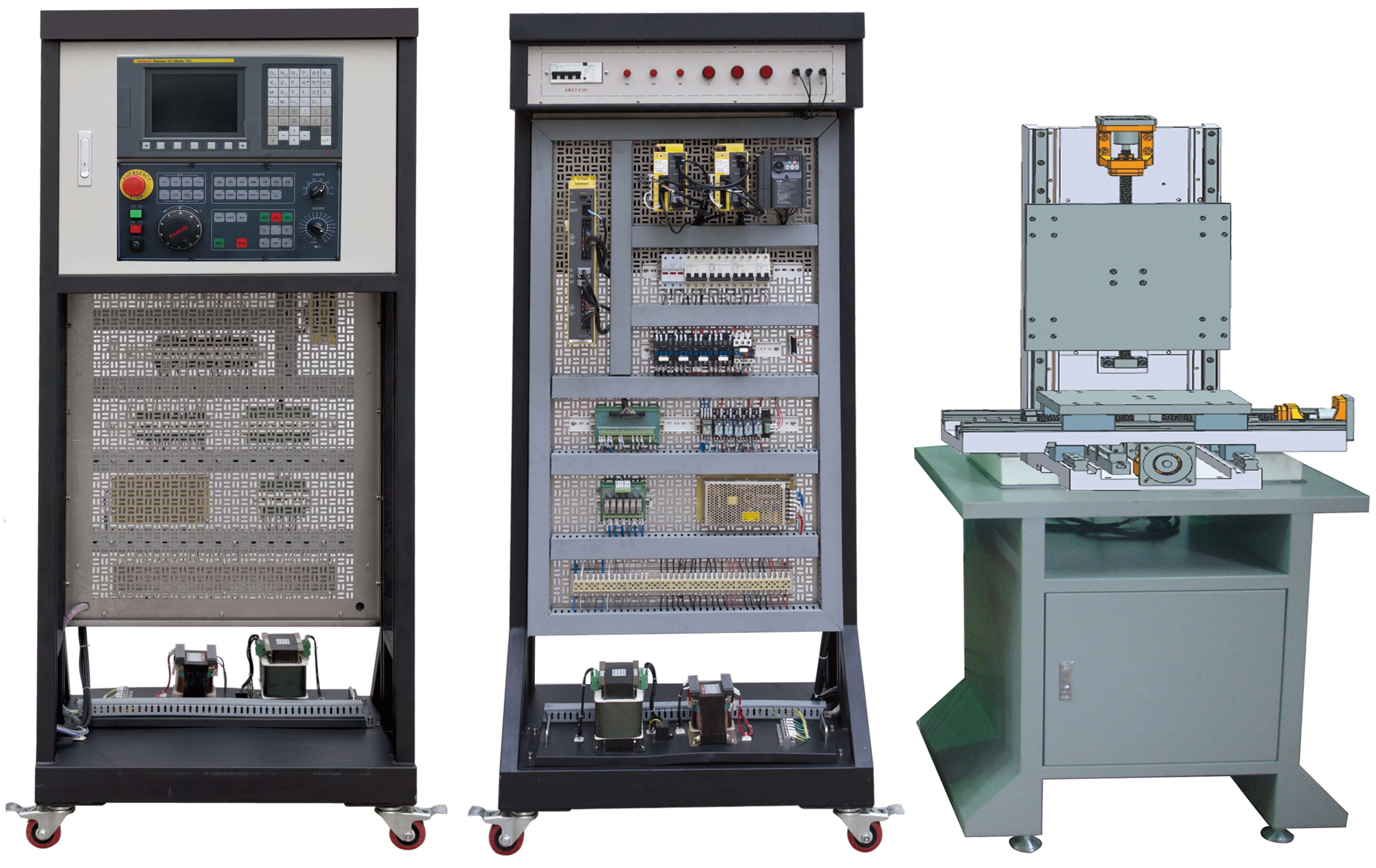 2.機床實訓(xùn)柜采用鐵質(zhì)亞光密紋噴塑結(jié)構(gòu),正面裝有數(shù)控系統(tǒng)和操作面板,背面為機床電氣柜,柜內(nèi)器件布局與實際機床廠的模式一致。電氣柜內(nèi)的電氣安裝板為不銹鋼網(wǎng)孔板,上面裝有變頻器、伺服驅(qū)動器、交流接觸器、繼電器、保險絲座、斷路器、開關(guān)電源、接線端子排和走線槽等;電氣柜底部還設(shè)有變壓器和接地端子等。