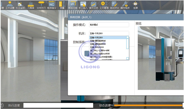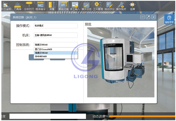 LGS-SX02型 數(shù)控車銑加工一體化創(chuàng)新仿真實訓(xùn)平臺的數(shù)字孿生機(jī)床仿真部分,操作極為簡單,放大、縮小、旋轉(zhuǎn)、平移、觸控等等。學(xué)生無需特殊訓(xùn)練,即可直接上手使用??芍С职ㄈS的數(shù)控機(jī)床如法蘭克、西門子、華中、廣數(shù),以及多軸的數(shù)控機(jī)床如西門子840D、華中848D、海德漢TNC640等主流操作系統(tǒng),支持加工中心、車床、斜床等數(shù)控機(jī)床設(shè)備,目前數(shù)控I8多軸智能訓(xùn)練機(jī)包含了11套不同類型數(shù)控系統(tǒng)設(shè)備。
