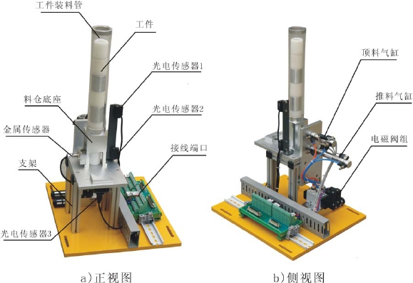 6、井式上料機(jī)構(gòu):井式工件庫(kù)1件,物料推出機(jī)構(gòu)1件,光電傳感器2只,磁性開(kāi)關(guān)2只,單缸氣缸1只,單控電磁閥1只,警示燈1只,主要完成將工件庫(kù)中的工件依次推出。氣缸及附屬傳感器選用SMC或其他名牌廠家正規(guī)產(chǎn)品。