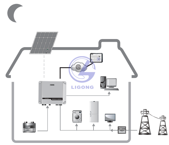 2、夜晚,光伏側(cè)直流停機(jī),由儲(chǔ)能電池通過儲(chǔ)能逆變器單獨(dú)給負(fù)載供電,當(dāng)電池剩余容量(SOC)放到設(shè)定值,系統(tǒng)自動(dòng)切入電網(wǎng),由電網(wǎng)給負(fù)載供電,根據(jù)需求,電網(wǎng)可以通過儲(chǔ)能逆變器給電池充電,也可以不充電;