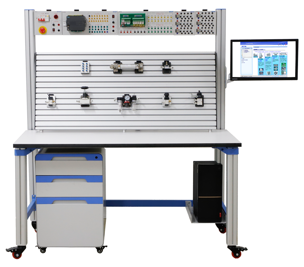 (1)采用工業(yè)鋁型材框架設(shè)計(jì),設(shè)有工業(yè)鋁合金型材操作面板,主要用于安裝氣動(dòng)相關(guān)元件;操作面板型材表面有標(biāo)準(zhǔn)的兩道固定槽,兩道之間距離40mm,最上面層主要用以放置電源控制模塊及電氣控制模塊,桌面為防火、防水、耐磨高密度板。