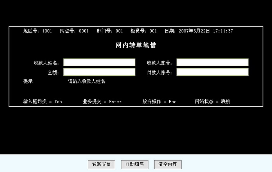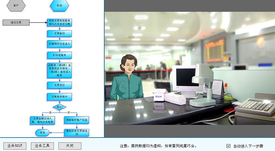 學(xué)生在經(jīng)過基礎(chǔ)的實(shí)務(wù)課程學(xué)習(xí)后,將被置于一個(gè)完全仿真的現(xiàn)代商業(yè)銀行的工作環(huán)境中,面對(duì)銀行每日的工作開始進(jìn)行模擬實(shí)操。學(xué)生們將會(huì)面對(duì)虛擬的客戶提出的各種要求來進(jìn)行相應(yīng)的處理。對(duì)于學(xué)生來講,實(shí)操過程中的所有操作都是自由的,他們需要通過完全自主的思考來判斷下一步的操作。譬如客戶提出的支票轉(zhuǎn)帳請(qǐng)求是否受理?如果不受理理由是什么?(譬如涉及支票的鑒別、簽章的鑒別等)接受以后如何操作?同時(shí)模擬系統(tǒng)根據(jù)內(nèi)置的業(yè)務(wù)邏輯自動(dòng)判斷學(xué)生操作的正確性,對(duì)其業(yè)務(wù)能力進(jìn)行實(shí)時(shí)的評(píng)價(jià)和記錄,并且將結(jié)果及時(shí)反饋給學(xué)生。通過每一步操作的自主思考和系統(tǒng)不斷的提示加強(qiáng)學(xué)生對(duì)于業(yè)務(wù)處理的理解,幫助其提高業(yè)務(wù)操作的熟練程度,并且培養(yǎng)其判斷分析能力。實(shí)操訓(xùn)練的內(nèi)容完全參照日常銀行業(yè)務(wù)操作所涉及的范圍,同時(shí)也可以根據(jù)實(shí)驗(yàn)課程主題的要求進(jìn)行具體的靈活配置。