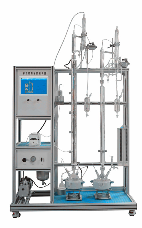 1、用于各種有機物質(zhì)的精制分離,裝置有兩個塔,一個為無側(cè)口的玻璃塔體,另一個為有五個側(cè)口的玻璃塔體,配有擺錘式的回流塔頭,既可以實現(xiàn)連續(xù)操作,又可以進行間歇操作,既可采用分相回流,又可采用混相回流。
