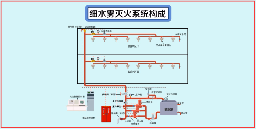 開式細水霧滅火系統(tǒng)的工作原理如圖所示。自動控制方式時,火災發(fā)生后,報警控制器受到兩個獨立的火災報警信號,自動啟動系統(tǒng)控制制閥組和消防水泵,向系統(tǒng)管網(wǎng)供水,水霧噴頭噴出細水霧,實施滅火。