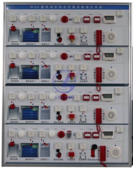 定制展示架由工業(yè)鋁型材制作、感煙探測器、感溫探測器、聲光警報器、火災(zāi)顯示盤、模擬消防電梯迫降模塊、應(yīng)急照明及疏散指示標(biāo)志、防排煙系統(tǒng)組件、消防應(yīng)急廣播模塊及揚聲器、消防電源強切、繼電器、按鈕、蜂鳴器等。實現(xiàn)火災(zāi)自動報警、聯(lián)動控制建筑物防排煙系統(tǒng)、消防噴淋泵、消防栓系統(tǒng)泵、電梯迫降、應(yīng)急照明疏散指示、電切、防煙樓梯間模擬演示功能,立體化實操教學(xué)設(shè)備。配置萬向輪、航空插頭插座、工業(yè)插頭插座,可與其他設(shè)備快速組合安裝。