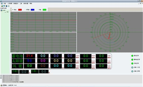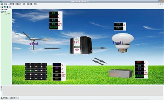 (2)顯示內(nèi)容:蓄電池電壓、風機電壓、光伏電壓、風機電流、光伏電流、風機功率、光伏功率,能量模擬圖,當前風速(米/秒),當前風向(度),當前風力資源平估。