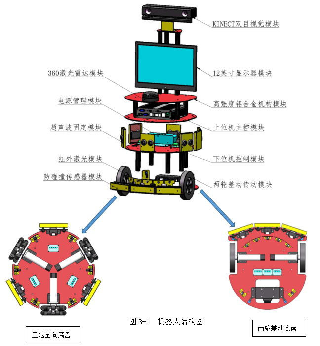 組成模塊: 1.嵌入式開發(fā)板:1塊; 2.直流伺服減速電機(jī):3個,電機(jī)驅(qū)動模塊:2個; 3.超聲波傳感器:6個,碰撞傳感器:6個,防跌落傳感器:6個; 4.電池:鋰電池1塊,平衡充電器:1個; 5.深度相機(jī):1臺,二維激光測距儀:1套; 6.I5控制器及顯示器1套; 7.機(jī)械結(jié)構(gòu)套件 1套; 8.全向輪:3個,差動輪:2個; 9.結(jié)構(gòu):3+1層,鋁合金材料; 10.安裝工具:1套, 鋁合金箱:1個; 11.組合后尺寸:320mm*320mm*(500-1200mm高度可調(diào))。 下層軟件功能: 1 機(jī)器人運(yùn)動控制功能(速度控制,位置控制,軌跡控制); 2 機(jī)器人循跡功能; 3 機(jī)器人漫游功能; 4機(jī)器人防跌功能; 5 機(jī)器人防撞功能。 上層軟件功能: 6 機(jī)器人室內(nèi)地圖構(gòu)建功能; 7 機(jī)器人室內(nèi)自主導(dǎo)航與規(guī)劃能; 8 機(jī)器人人體跟蹤功能; 9 機(jī)器人語意識別與對話功能; 10 機(jī)器人人體姿態(tài)識別功能; 11 機(jī)器人三維仿真功能; 12 機(jī)器人3D地圖構(gòu)建功能。 |