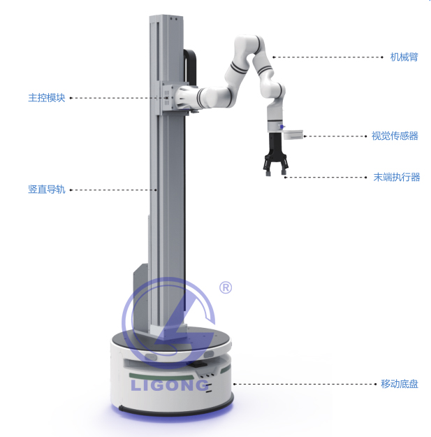 LGAI-FR01型 人工智能機(jī)器人實訓(xùn)科研平臺將移動底盤、豎直導(dǎo)軌、機(jī)械臂、視覺傳感器、末端工具通過主控模塊集成于一體。與傳統(tǒng)的“機(jī)器人+AGV”形式的復(fù)合機(jī)器人相比,增加了升降系統(tǒng),進(jìn)一步擴(kuò)大了機(jī)器人的工作空間。同時在機(jī)械臂末端不僅配備了執(zhí)行工具,還集成了一款開源的3D視覺傳感器,來保證機(jī)器人在充足的工作空間下,具有更高的任務(wù)準(zhǔn)確性和靈活性。復(fù)合升降機(jī)器人為物流倉儲、無人貨柜等應(yīng)用場景,提供了一體化集成方案,實現(xiàn)機(jī)器人在結(jié)構(gòu)化場景內(nèi),進(jìn)行無軌導(dǎo)航及路徑規(guī)劃,同時滿足三維空間作業(yè)能力的需求,實現(xiàn)全范圍、大空間的自主移動、自主動態(tài)抓取。